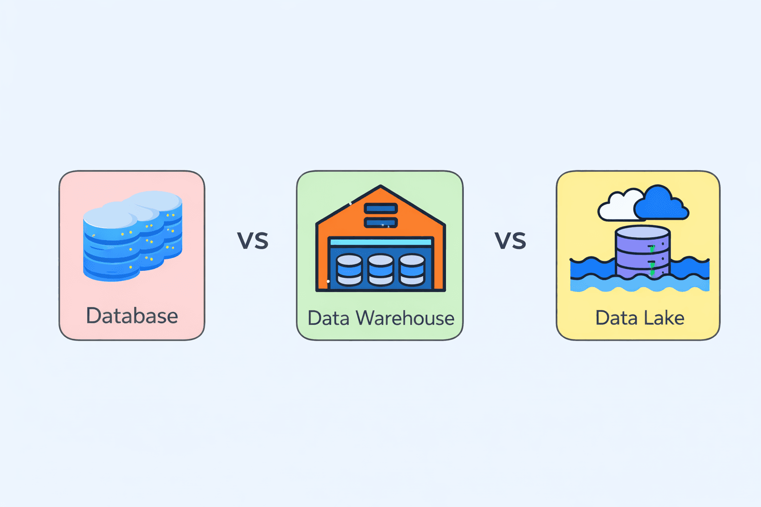 Learn the differences between databases, data warehouses, and data lakes, with real-world examples, use cases, and a practical guide to choosing the right system.