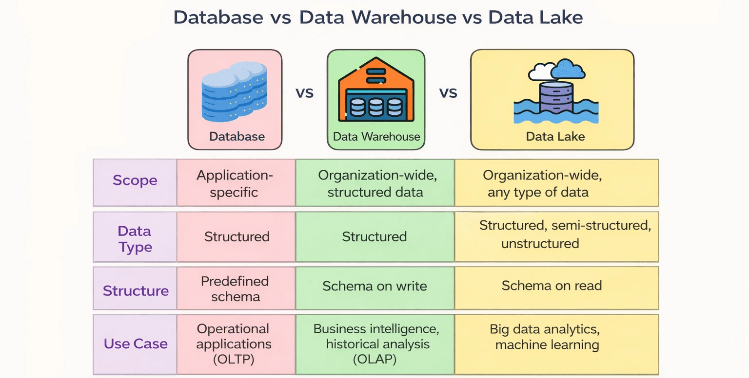 What Are the Key Differences Between a Database, Data Warehouse, and Data Lake?